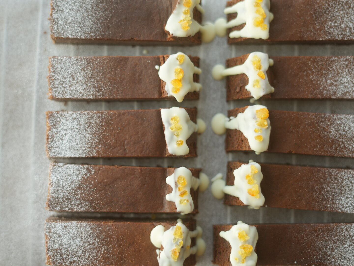 ほんのりオレンジ香る、生地はもちろんボトムもショコラ♡ホワイトチョコをかけた部分が雪を被った山のようです。
