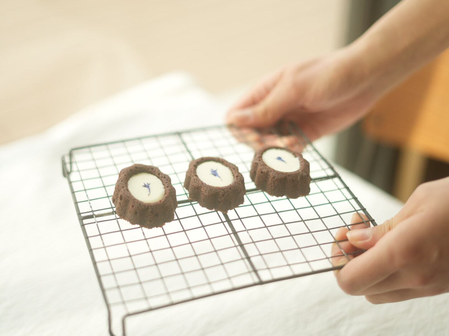 焦がしバターとアーモンドが香る生地にチョコレートを混ぜ込みました。中心にはホワイトチョコのガナッシュを流し込み、しっとり食感もお楽しみいただけます。